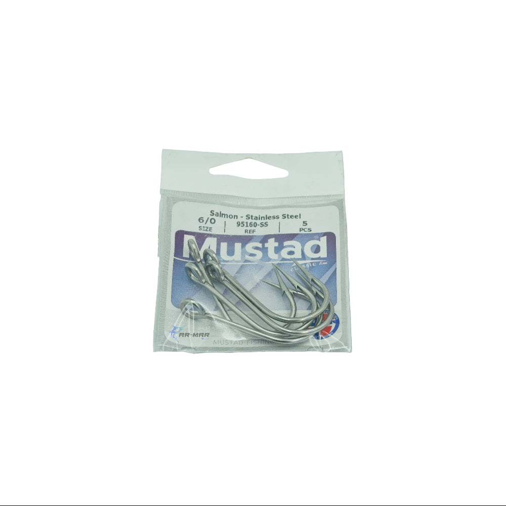 Los anzuelos Mustad Salmon, estilo Siwash/Salmon Single, son hook-forged (forjados) de alta resistencia (3X strong), con punto hueco (hollow point) para penetración rápida y ojo abierto o looped up-eye. Ideales para pesca de salmones, steelhead y peces grandes usando spoons, crankbaits o carnada viva.