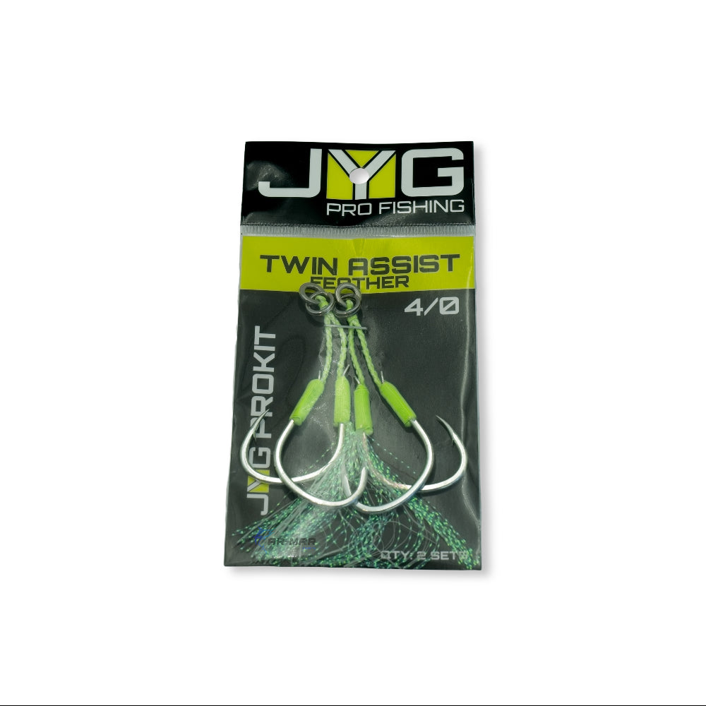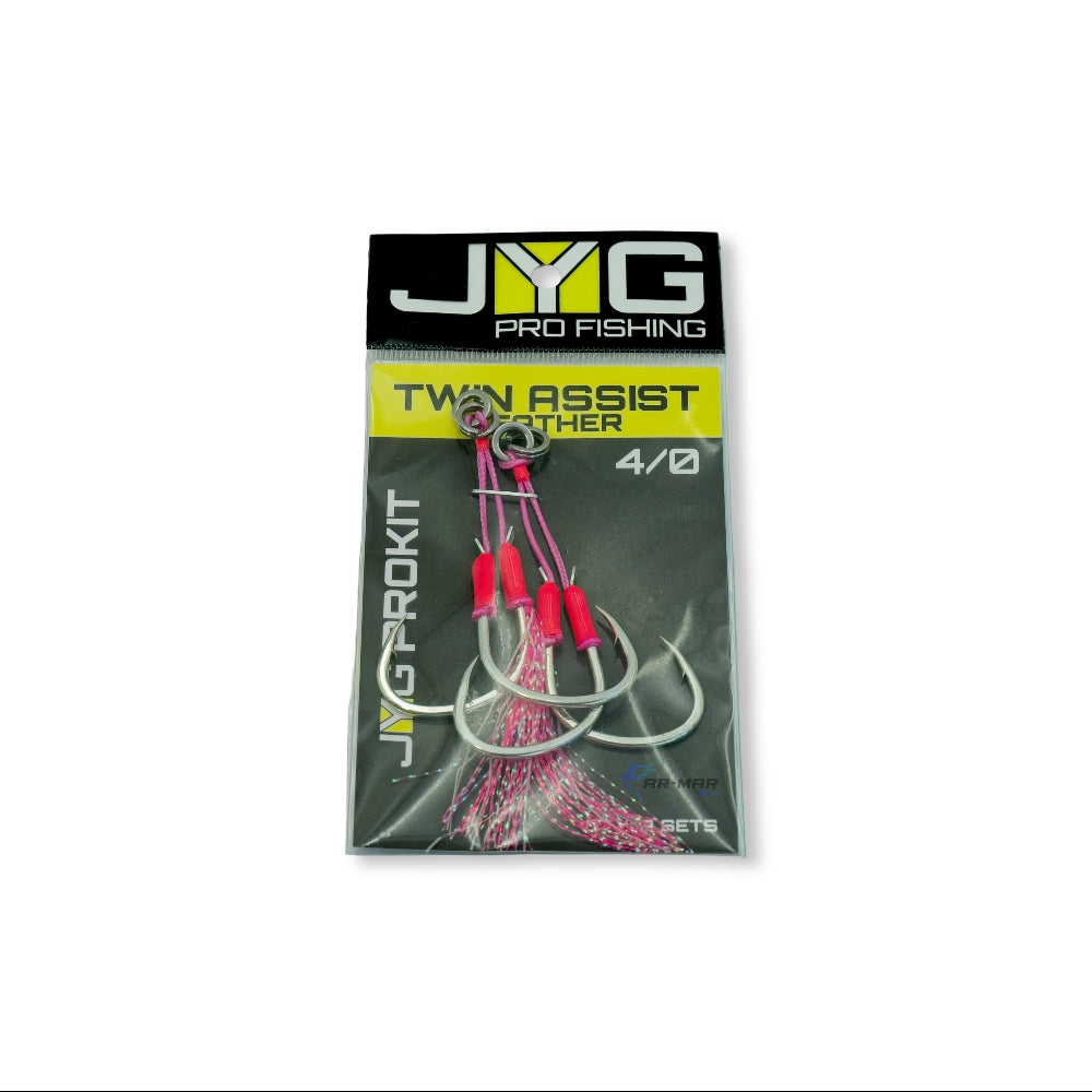 Los asist hooks Jyg Pro Fishing Twin Feather destacan por su diseño con plumas de alta visibilidad que aumentan el atractivo del jig durante el descenso y recuperación. Disponibles en colores rosa y verde, y en múltiples tamaños (#1/0, #3/0, #4/0, #5/0), son ideales para jigging en aguas profundas y atraen depredadores como jureles, atunes y pargos.