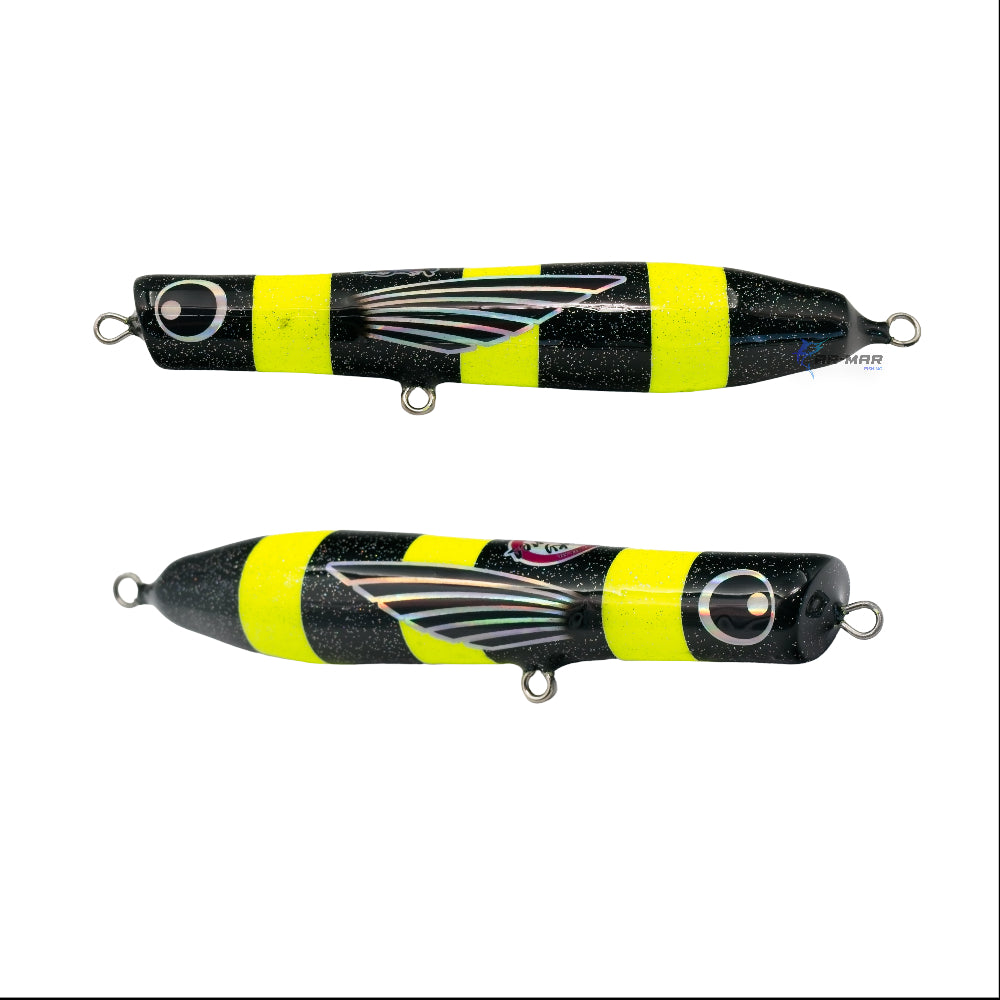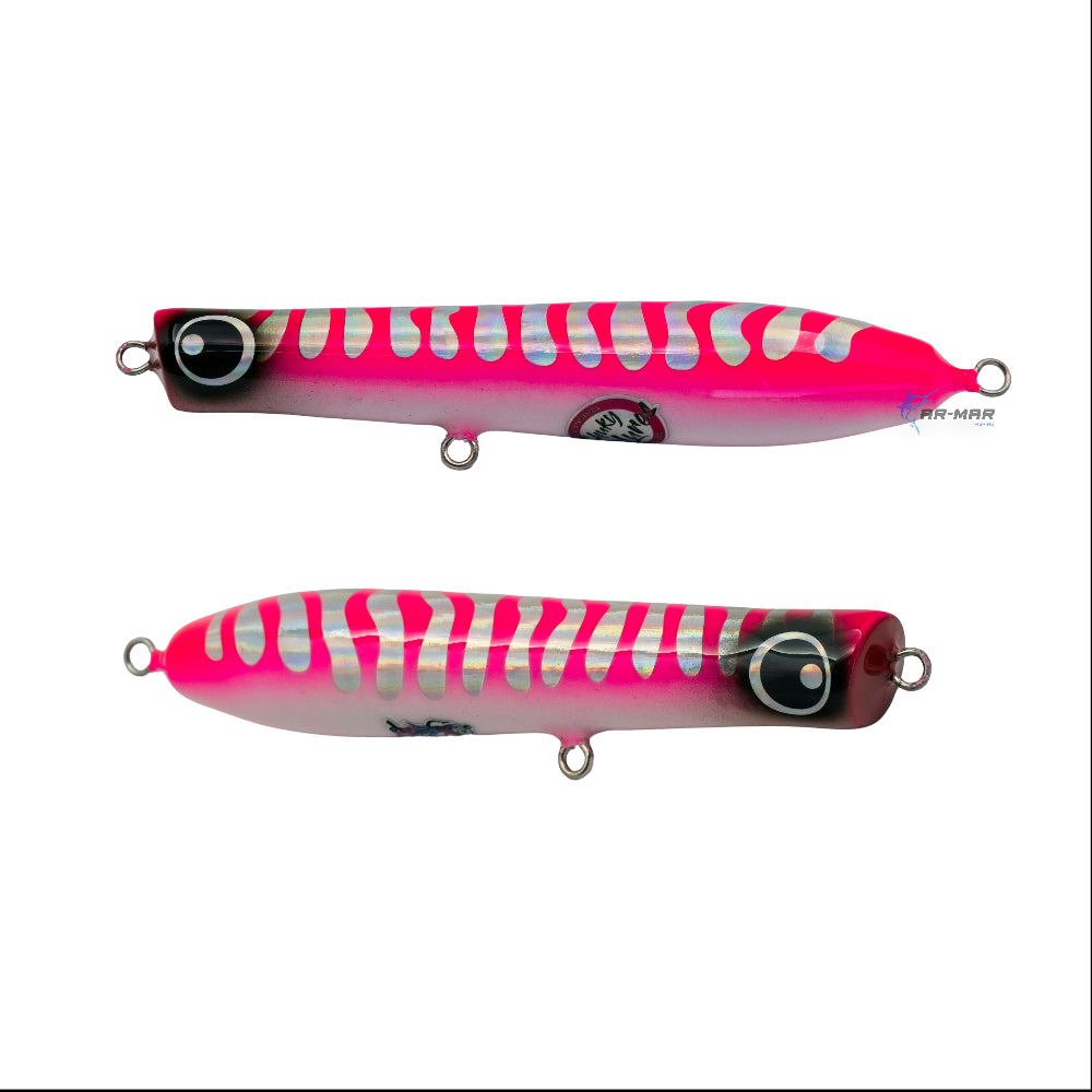 El Chuky Lures Bullet Surf es un señuelo artesanal de 16 cm y 3 oz, construido en madera y diseñado para pesca de alta exigencia. Su forma tipo pencil le permite trabajar en superficie con una acción rápida o estilo walking the dog, generando destellos y desplazamientos que provocan ataques explosivos. Funciona de maravilla desde orilla para peces costeros agresivos, y también brilla en el offshore gracias a su gran capacidad de lance y estabilidad en el agua. Ideal para atunes, cuberas, gallos, dorados y hasta picudos, es un señuelo hecho en México con potencia, estilo y una respuesta increíble en situaciones reales de pesca.