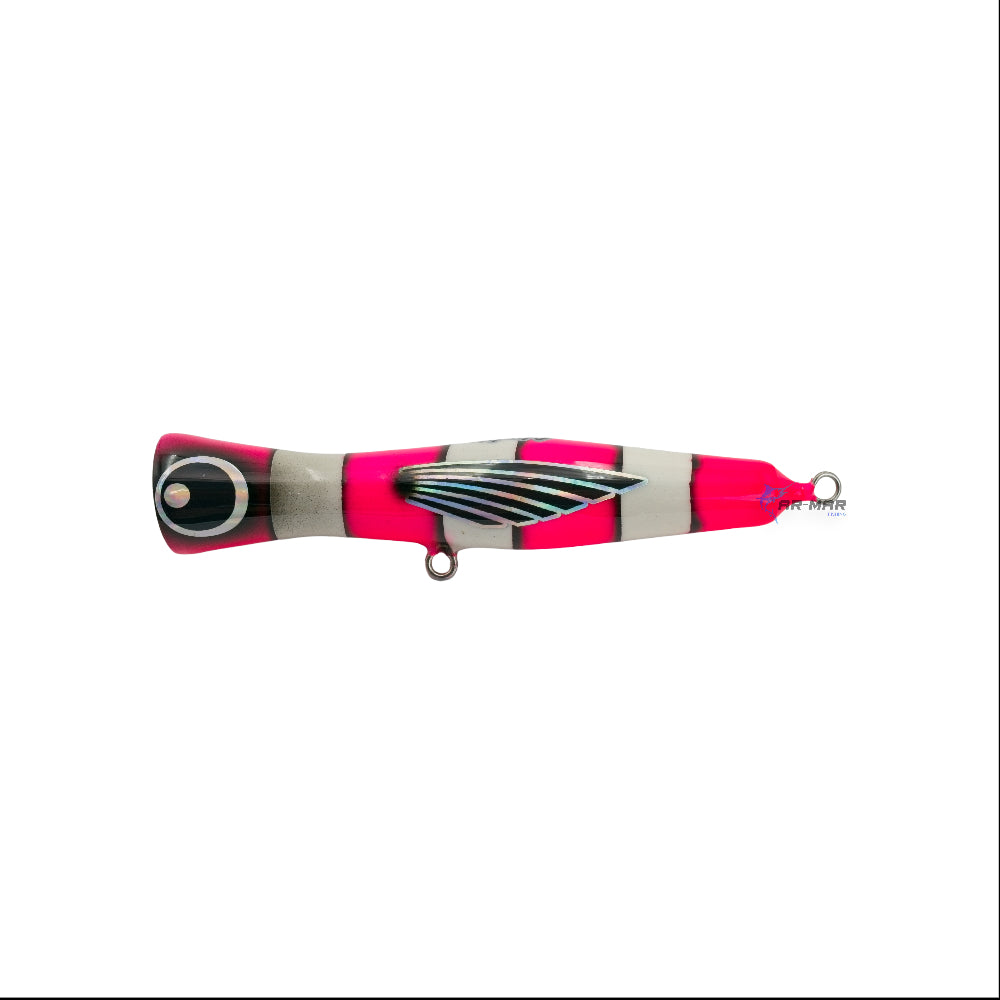 El Chuky Lures Popper Tanke 18 cm 2.5 oz es un señuelo artesanal hecho a mano en México, diseñado para generar potentes explosiones en la superficie que atraen a los depredadores más agresivos. Fabricado con resina, plomo y alambre de acero inoxidable, ofrece resistencia y durabilidad frente a especies de gran potencia. Cada pieza está pintada y terminada a mano, lo que garantiza un acabado único, realista y altamente resistente a las condiciones de agua salada.